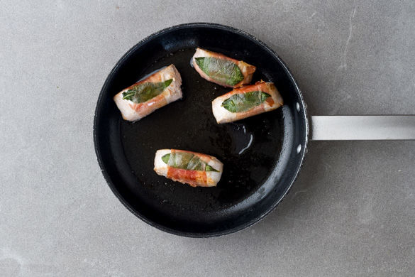 Jedes Fleischstück mit 1–2 Salbeiblättern belegen und mit Schinken umwickeln.
