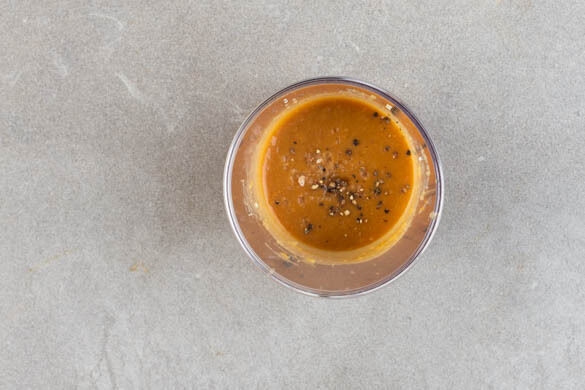 Den Knoblauch aus der Schale drücken und mit den Kartoffelhälften, der Misopaste, der restlichen Sojasauce, 1TL Honig, ½TL Essig und 4EL Wasser in einem hohen Gefäß mit einem Stabmixer cremig pürieren. Tipps: Für mehr Sämigkeit eine weitere Kartoffelhälfte mitpürieren. Ist das Dressing zu dickflüssig, ggf. löffelweise Wasser hinzufügen.