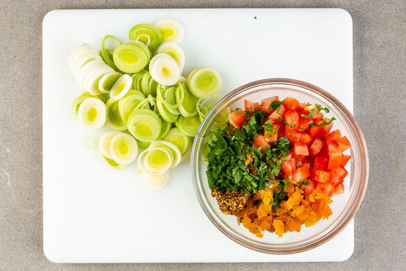 Den Koriander grob schneiden. Die Tomaten in ca. 1cm große Würfel schneiden. 1EL hellen Essig mit 1TL Senf und 1TL Honig verrühren und mit dem Koriander, den Tomaten und den Rosinen zu einem Salat vermengen. Den Lauch in dünne Ringe schneiden.