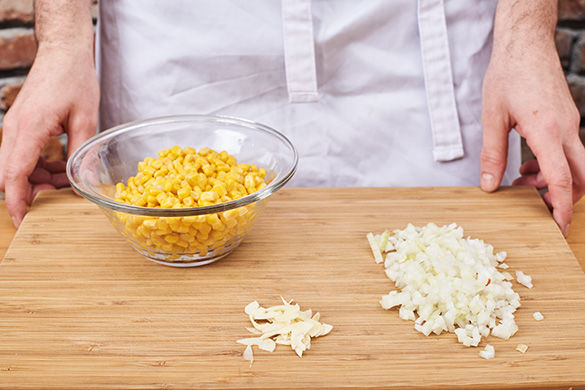 Den Umluftofen auf 180°C vorheizen. Die Zwiebel schälen, halbieren und in Würfel schneiden. Den Knoblauch schälen und in dünne Scheiben schneiden. Mais im Sieb abtropfen lassen.