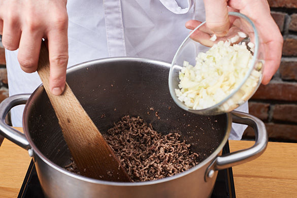 In einem Topf 1-2EL Olivenöl mittelhoch erhitzen und das Hackfleisch ca. 4-5 Min. anbraten. Nun die Zwiebeln und den Knoblauch hinzufügen und weitere 2-3Min. braten. Dann mit dem Kreuzkümmel nach Geschmack bestäuben, kurz mitrösten und schließlich mit den passierten Tomaten ablöschen. Für ca. 7-10Min. einköcheln lassen und mit Salz und Pfeffer abschmecken.