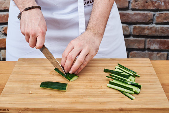 Inzwischen die Gurke evtl. schälen, der Länge nach vierteln und das Kerngehäuse entfernen. Nun die Gurkenstücke in dünne Streifen schneiden.