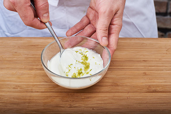 Inzwischen die Schale der Limette abreiben und den Saft auspressen. 1-2TL Abrieb zusammen mit 1-2EL Limettensaft und dem Joghurt vermischen. Mit etwas Salz und Pfeffer abschmecken.