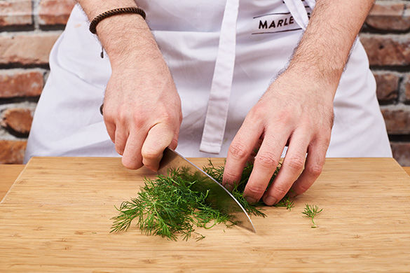 Die Tortillas für ca. 1-2Min. im Ofen erwärmen. Den Dill grob hacken. Inzwischen den Mais zu der Hackmasse geben und kurz erwärmen.