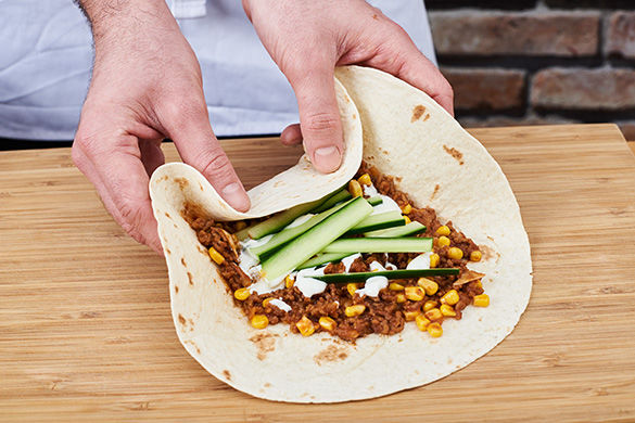 Die Tortillas ausbreiten und die Hackmasse darauf verteilen, dann etwas von dem Limettenjoghurt und schließlich die Gurken und den Dill darauf verteilen. Die Burritos einwickeln und mit dem übrigen Joghurt servieren.