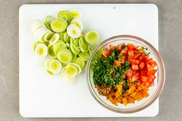 Den Koriander grob schneiden. Die Tomaten in ca. 1cm große Würfel schneiden. 2EL hellen Essig mit 2TL Senf und 2TL Honig verrühren und mit dem Koriander, den Tomaten und den Rosinen zu einem Salat vermengen. Den Lauch in dünne Ringe schneiden.
