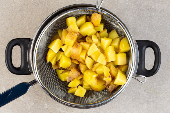 In einem mittelgroßen Topf ausreichend gesalzenes Wasser für die Kartoffeln zum Kochen bringen. Die Kartoffeln samt Schale in ca. 1cm große Würfel schneiden, dann in das kochende Wasser geben und bei starker Hitze in 10–12Min. bissfest kochen. In ein Sieb abgießen und abtropfen lassen.