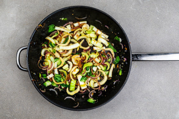 Den weißen Teil des Pak Choi, die Zwiebeln, den Knoblauch und den Ingwer mit der Sojasauce in der Pfanne 1–2Min. bei mittlerer Hitze anbraten. Anschließend abgedeckt bei mittlerer bis niedriger Hitze 3–4Min. garen. Die Lauchzwiebel in feine Ringe schneiden.