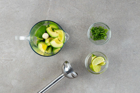 Den Koriander fein schneiden. Den Knoblauch schälen. 1/2 Limette auspressen, restliche Limette in Spalten schneiden. Die Avocado halbieren und das Fleisch mit dem Limettensaft, dem Knoblauch und 2–3EL Wasser pürieren. Mit Salz und Pfeffer würzen und mit den Röstzwiebeln auf den Süßkartoffeln anrichten. Mit Koriander und Limettenspalten servieren.