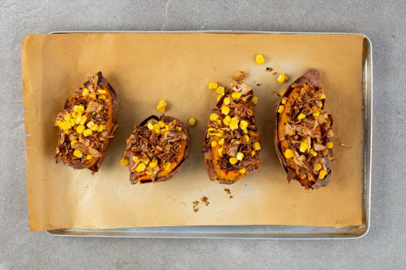 Die Süßkartoffeln auf dem Backblech vorsichtig wenden, längs einschneiden und mit der Jackfrucht-Mais-Masse füllen. Anschließend weitere 8–12Min. backen.
