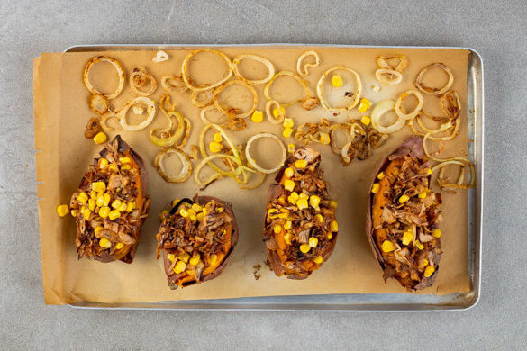 Gebackene Süßkartoffeln werden mit einer knusprig-würzigen Jackfrucht-Mais-Füllung im Ofen überbacken und mit gerösteten Zwiebelringen, einer feinen Avocado-Limetten-Creme und frischem Koriander serviert. Vegane Küche der Extraklasse und ein Fest der Farben noch dazu!