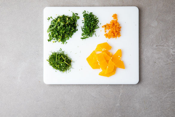 Die Petersilie und den Dill samt Stängeln fein hacken. Den Schnittlauch in kleine Röllchen schneiden. Von 1 Orange ca. 2TL Schale abreiben, dann die Orange halbieren und auspressen. Die zweite Orange schälen und in kleine Stücke schneiden.