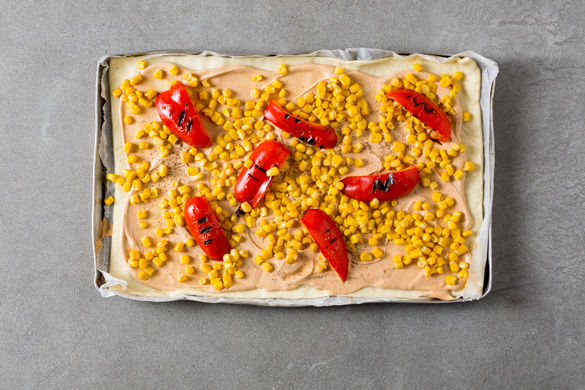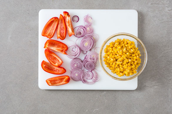 Den Backofen auf 220°C Umluft vorheizen. Die Paprika halbieren, entkernen und in 2cm breite Streifen schneiden. Die Zwiebeln schälen und in hauchdünne Ringe schneiden. Den Mais in einem Sieb abtropfen lassen.