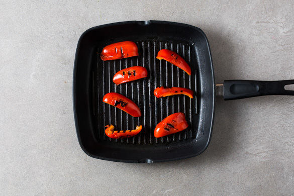 Die Paprikastreifen mit 1–2EL Pflanzenöl vermengen und in einer Grillpfanne oder einer beschichteten Pfanne auf höchster Stufe 2–3Min. ohne Wenden anbraten. Erst jetzt wenden und weitere 2–3Min. braten. Es sollten deutliche Grillspuren zu sehen sein. Die Paprika salzen und aus der Pfanne nehmen.