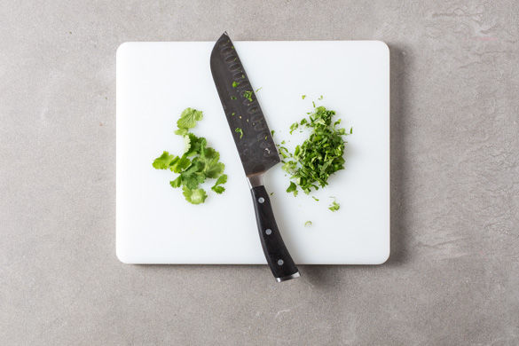 Die Korianderblätter abzupfen und fein schneiden. Die Pizzen in Stücke schneiden und nach Geschmack mit den eingelegten Zwiebeln und dem Koriander garniert servieren.