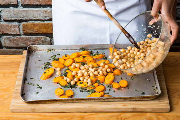 Sobald die Karotten leicht gebräunt sind, die Kichererbsen für weitere ca. 10Min. auf dem Blech mitgaren.