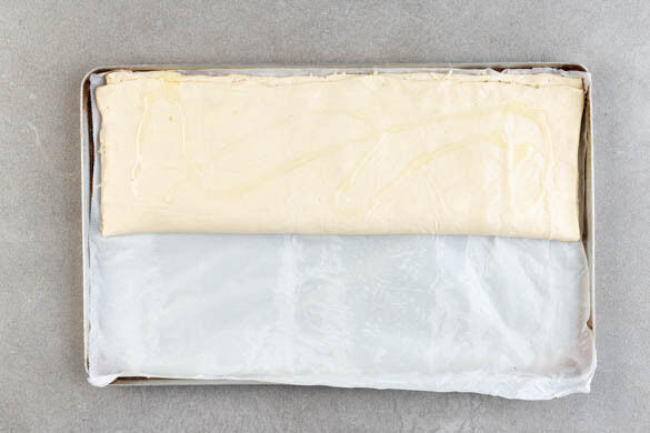 1 Teig mit dem Papier nach unten auf einem Backblech ausrollen und mit einer Gabel einige Male einstechen. Mit der Gewürzmischung und dem Käse bestreuen. Den anderen Teig mit dem Papier nach oben darüber legen. Das obere Papier abziehen, die Ränder zusammendrücken, dann den Teig mit 2TL Olivenöl bestreichen.