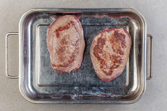 Das Fleisch trocken tupfen, von beiden Seiten mit Salz und Pfeffer würzen und in einer mittelgroßen Pfanne mit 1EL Olivenöl bei starker Hitze auf jeder Seite ca. 1Min. scharf anbraten. Anschließend in eine Auflaufform geben und 5–7Min. im Ofen garen, dann abgedeckt auf einem Teller außerhalb des Ofens ruhen lassen.