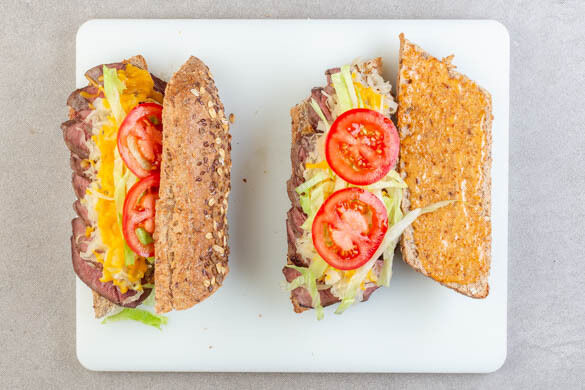 Es muss nicht immer Burger sein, wie dieses köstliche und prall gefüllte Sandwich beweist! Das herzhafte Vollkornbrötchen wird reichhaltig belegt mit saftigen Bio-Rindersteakscheiben, Sauerkraut und Cheddar sowie einem cremig-würzigen Dip. Dazu gibt es knackigen Salat und leckere Karottensticks aus dem Ofen. Guten Appetit!