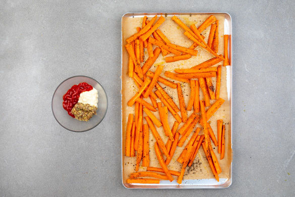 Den Backofen auf 200°C (180°C Umluft) vorheizen. 4EL Mayonnaise mit 2EL körnigem Senf und 2EL Ketchup verrühren und mit Salz und Pfeffer abschmecken. Die Karotten ggf. schälen und quer halbieren, dann in ca. 1cm breite Streifen schneiden. Auf einem mit Backpapier ausgelegten Backblech mit 2EL Olivenöl und je 1 kräftigen Prise Salz und Pfeffer mischen und im Ofen in 20–25Min. goldbraun rösten.