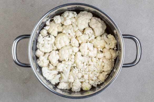 Den Blumenkohl in das kochende Wasser geben und 7–9Min. kochen, bis er sehr weich ist. Mit einer Schaumkelle aus dem Wasser heben und in den Topf mit der Milch geben. Den Topf mit dem Wasser auf dem Herd lassen.