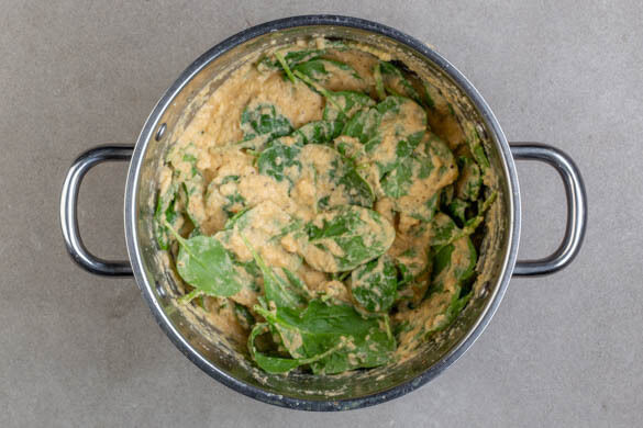 Den Blumenkohl im Milchtopf zu einer Sauce pürieren. Den Spinat portionsweise hinzugeben und bei mittlerer bis hoher Hitze 4–6Min. köcheln, bis er zusammenfällt, dabei gelegentlich umrühren. Tipp: Wenn die Sauce am Boden anhaftet, etwas Wasser hinzugeben. Vom Herd nehmen und mit Salz und Pfeffer abschmecken.