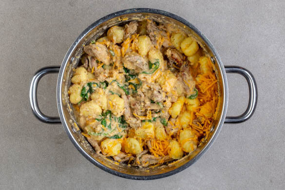 Die Gnocchi in das kochende Wasser geben und 2–3Min. kochen lassen, bis sie gar sind und an der Oberfläche schwimmen. In ein Sieb abgießen, abtropfen lassen und mit der ½ des Käses und dem Fleisch unter die Blumenkohlsauce rühren.
