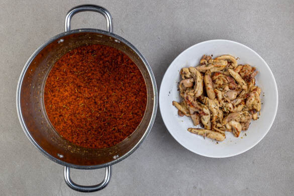 In einem zweiten großen Topf das Fleisch mit 4EL Butter bei mittlerer Hitze 3–4Min. anbraten, dann aus dem Topf nehmen. Den Knoblauch und die Gewürzmischung in den Topf geben und unter die geschmolzene Butter rühren, dann 200ml Milch und ½TL Salz einrühren und vom Herd nehmen.
