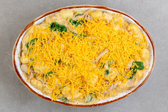 Die Gnocchi in das kochende Wasser geben und 2–3Min. kochen lassen, bis sie gar sind und an der Oberfläche schwimmen. In ein Sieb abgießen, abtropfen lassen und mit der ½ des Käses und dem Fleisch unter die Blumenkohlsauce rühren.