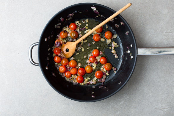 Die Zwiebeln in einer mittelgroßen Pfanne mit 1EL Olivenöl bei mittlerer Hitze 2–3Min. glasig anschwitzen. Die Tomaten hinzugeben und 1–2Min. mitbraten. Darauf achten, dass die Tomaten nicht zu weich gekocht werden.