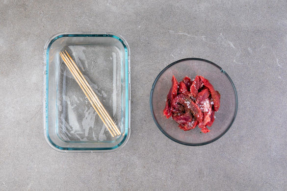 In einem mittelgroßen Topf ausreichend gesalzenes Wasser für den Brokkoli zum Kochen bringen. Das Fleisch mit etwas Küchenkrepp trocken tupfen, quer in dünne Streifen schneiden und mit Salz und Pfeffer würzen. Bei Verwendung von Schaschlikspießen aus Holz diese in einer flachen Schale oder Auflaufform in kaltem Wasser einweichen.