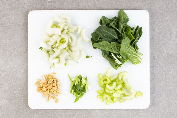 Den Pak Choi längs halbieren, den weißen Teil in ca. 1cm breite Streifen schneiden, die grünen Blätter grob schneiden. Den Stangensellerie in ca. 0,5cm breite Stücke schneiden. Die Lauchzwiebel in ca. 1cm breite Ringe schneiden. Die Erdnüsse grob hacken.