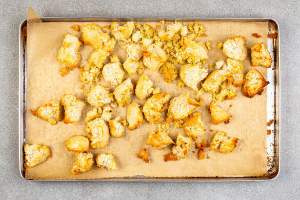Das Brötchen in ca. 3cm große Stücke zupfen, dann ⅔ der Brötchenstücke auf einem mit Backpapier ausgelegten Backblech mit 1EL Hefeflocken, dem restlichen Knoblauch, 1EL Olivenöl und ½TL Salz vermengen. Im Ofen in 2–3Min. goldbraun und knusprig rösten.