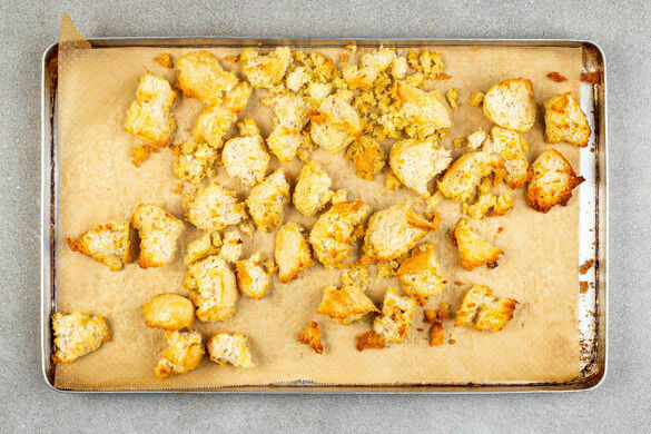Die Brötchen in ca. 3cm große Stücke zupfen, dann ⅔ der Brötchenstücke auf einem mit Backpapier ausgelegten Backblech mit 2EL Hefeflocken, dem restlichen Knoblauch, 2EL Olivenöl und 1TL Salz vermengen. Im Ofen in 2–3Min. goldbraun und knusprig rösten.