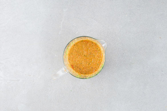 2 Tomaten in kleine Stücke schneiden und mit 1 Prise Salz und ca. 3/4TL Zucker cremig pürieren. Tipp: Entweder ein zweites Gefäß verwenden oder das Pesto in eine kleine Schüssel umfüllen, das Gefäß kurz ausspülen und erneut verwenden.