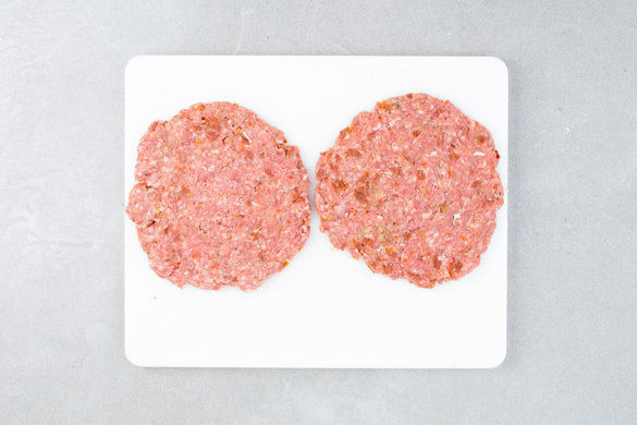 Die getrockneten Tomaten in dünne Streifen schneiden und mit dem Hackfleisch und dem restlichen Knoblauch verkneten. Aus der Masse 4 gleich große Pattys formen.