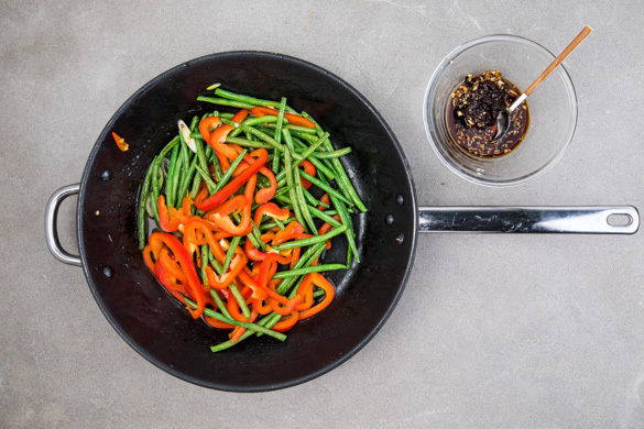Die Bohnen, die Paprika und die weißen Lauchzwiebelringe mit einem Spritzer Wasser in der Pfanne 2–3Min. anbraten, dann abgedeckt 4–5Min. garen. In der Zwischenzeit den Knoblauch schälen, fein reiben oder würfeln und mit der Bohnensauce, der Sojasauce und 2–3EL (mildem) Essig zu einer Würzsauce verrühren.