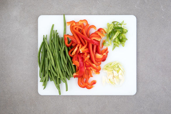 Die Enden der Bohnen abschneiden. Die Paprika vierteln, entkernen und in dünne Streifen schneiden. Die Lauchzwiebel schräg in feine Ringe schneiden, dabei die grünen und weißen Lauchzwiebelringe trennen.