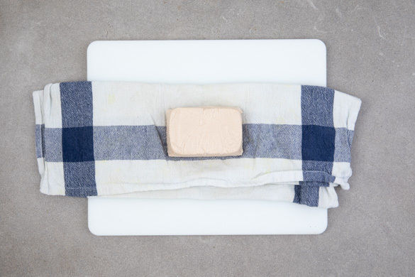 Den Tofu etwas abtropfen lassen, in ein sauberes Küchentuch wickeln und mit einer schweren Pfanne beschweren, um möglichst viel Flüssigkeit auszupressen.