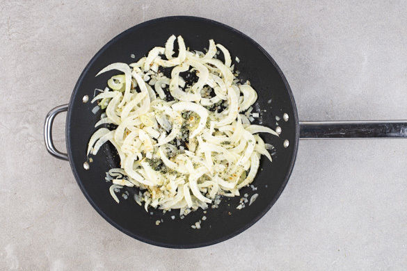Den Fenchel und den Oregano zu den Zwiebeln in die Pfanne geben. Mit der 1/2 der Gewürzmischung sowie Salz und 1 Prise Zucker würzen und alles ca. 3Min. braten.