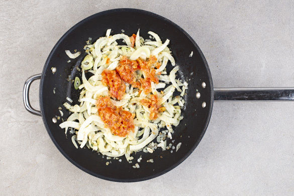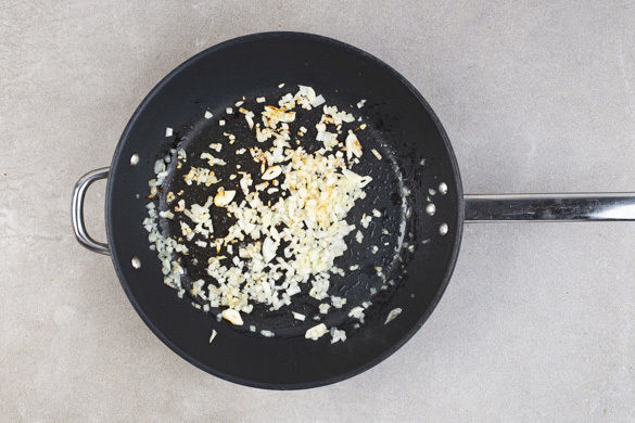 Die Zwiebeln und den Knoblauch in einer großen Pfanne mit 1EL Olivenöl und 1 Prise Salz bei starker Hitze ca. 2Min. anbraten. In einem großen Topf ausreichend gesalzenes Wasser für die Pasta zum Kochen bringen.