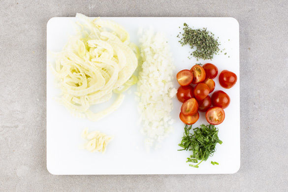 Den Fenchel halbieren und in dünne Streifen schneiden, dabei den Strunk entfernen. Die Tomaten halbieren. Die Basilikumblätter abzupfen und in feine Streifen schneiden. Die Oreganoblätter abzupfen und fein schneiden. Die Zwiebeln schälen, halbieren und fein würfeln. Den Knoblauch schälen und in dünne Scheibchen schneiden.