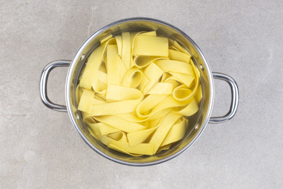 Die Lasagneblätter längs in dünne Streifen schneiden, in das kochende Wasser geben und in 2–3Min. bissfest kochen. In ein Sieb abgießen und abtropfen lassen.