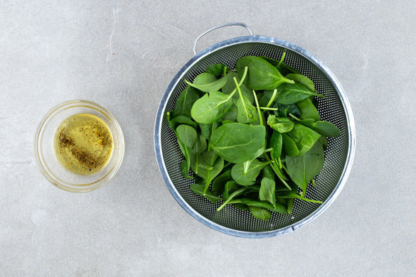 Je 1EL Olivenöl, Essig und Wasser mit je 1 Prise Salz, Pfeffer und Zucker zu einem Dressing verrühren und mit dem übrigen Spinat vermengen. Die Rösti mit dem Rahmgemüse und dem Spinatsalat anrichten, mit den Pinienkernen garnieren und mit dem Dattelchutney servieren.