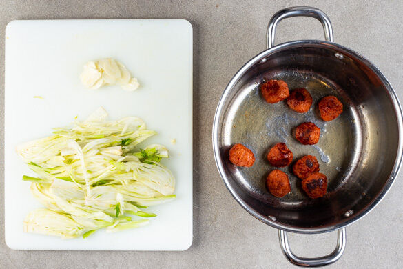 Das vegane Hack mit den Händen in 8–10 kleine Bällchen formen und diese in einem mittelgroßen Topf mit 2EL Olivenöl bei mittlerer bis starker Hitze 5–8Min. rundum goldbraun braten. Den Knoblauch schälen und in feine Scheibchen schneiden. Den Fenchel längs in dünne Streifen schneiden, dabei den Strunk und die Stiele entfernen.