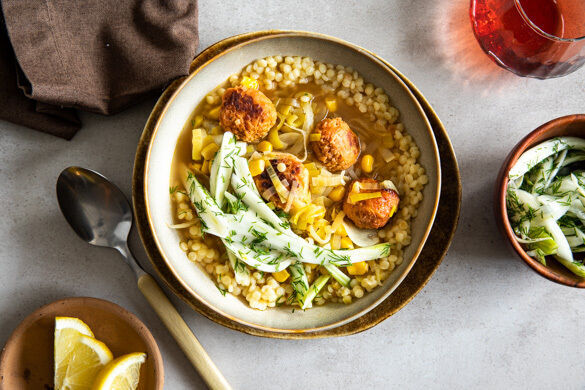 Mit dem heutigen Wohlfühlgericht wird auch der stürmischste Herbst- oder Winterabend zum besinnlichen Fest der Gemütlichkeit: Vegane „Hackbällchen“ blubbern in einer wärmenden Brühe mit aromatischem Fenchel, Lauch und Mais vor sich hin, während du ein zitroniges Fenchel-Dill-Relish zubereitest. Als extra Sättigungseinlage gibt’s leckeren Perlencouscous. Soll sich das Wetter ruhig austoben – in der Küche ist alles in Butter!