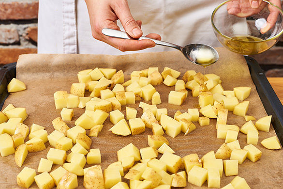 Inzwischen die Kartoffeln samt Schale in 1–2cm kleine Würfel schneiden und auf ein mit Backpapier ausgelegtes Backblech geben. Mit 1EL Olivenöl beträufeln und im Ofen in 15–20Min. goldbraun und gar rösten.