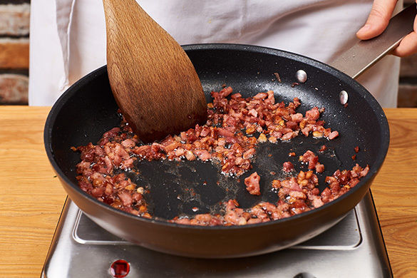 Den Speck in einer kleinen Pfanne bei mittlerer Hitze in 4–5Min. langsam braten, bis er schön kross ist. Nebenher die Paprika vierteln, entkernen und in feine Streifen schneiden.