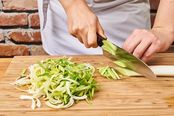 Den Lauch der Länge nach halbieren und schräg in feine Streifen schneiden. Ca. 10Min. vor Ende der Kochzeit zu den Linsen in den Topf geben und mitgaren, bei Bedarf noch etwas Wasser dazugeben.
