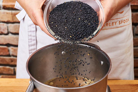 Den Backofen auf 220°C Umluft (240°C Ober-/Unterhitze) vorheizen. In einem großen Topf 800ml Wasser mit dem Brühwürfel aufkochen. Die Linsen in das kochende Wasser geben und 20–25Min. bei mittlerer Hitze köcheln lassen, bis sie gar sind.